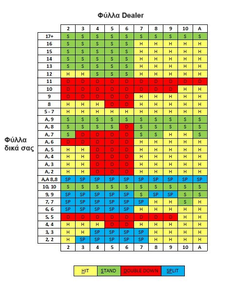 Για να τον χρησιμοποιήσετε, αρχικά κοιτάξτε τα φύλλα σας και βρείτε το σύνολό τους στην αριστερή στήλη του πίνακα. Έπειτα, βρείτε το φύλλο του ντίλερ στην πάνω γραμμή. Η τομή αυτών των δύο γραμμών σας λέει τι να κάνετε. Είτε να πάρετε άλλο φύλλο (H), είτε να μείνετε (S), είτε να σπάσετε τα φύλλα σας αν είναι ζευγάρι (SP), είτε να διπλασιάσετε το στοίχημά σας αν επιτρέπεται (D).