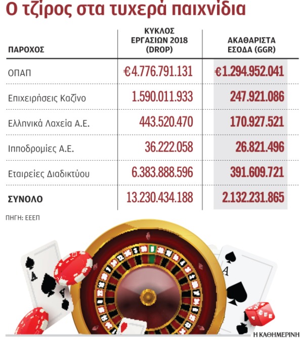 Περισσότερα από 16 δισ. ευρώ πόνταραν οι Έλληνες παίκτες σε τυχερά live παιχνίδια, την περασμένη χρονιά. Με στοιχεία που σημοσίευσε η Επιτροπή Εποπτείας και Ελέγχου Παιγνίων (ΕΕΕΠ), γίνεται γνωστό ότι οι Έλληνες πόνταραν πέρυσι 13,2 δισ. ευρώ σε όλα τα νόμιμα παίγνια, αφήνοντας στους παρόχους ακαθάριστα έσοδα ύψους 2,1 δισ. ευρώ. Τα ακαθάριστα έσοδα (gross gaming revenues, GGR) προκύπτουν από τα πονταρίσματα αν αφαιρεθούν οι επιστροφές (κέρδη) στους παίκτες. Ο τζίρος ωστόσο στα τυχερά παίγνια είναι ακόμη μεγαλύτερος από τα στοιχεία που παρέχει η ΕΕΕΠ, καθώς σε αυτόν δεν περιλαμβάνεται ο αντίστοιχος του ΟΠΑΠ στα VLTs. Η υψηλή ανακύκλωση κερδών που ξεπερνάει το 90% στη συγκεκριμένη κατηγορία τυχερών παιγνίων, δημιουργεί τεράστιo τζίρο που για το 2018 εκτιμάται ότι ξεπέρασε τα 3 δισ. ευρώ. Αρα, συνολικά το ποντάρισμα ανέρχεται στα 16,2 δισ.