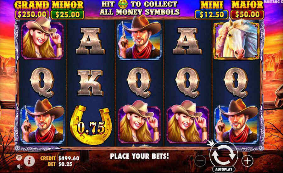 Ενώστε τις δυνάμεις σας με τους rangers της αμερικάνικης δύσης στο Mustang Gold, το 5στηλο φρουτάκι με 25 πιθανούς συνδυασμούς από την Pragmatic Play. Όπως τα περισσότερα φρουτάκια, έτσι και αυτό είναι διαθέσιμο σε όλες τις συσκευές και τα πονταρίσματά του κυμαίνονται από τα 0.25 ως τα 125 νομίσματα ανά γύρισμα. Οι μεγαλύτεροι συνδυασμοί γίνονται στους έξτρα γύρους, οι οποίοι δεν έχουν όριο και το μεγαλύτερο Χ φτάνει το 1,000.