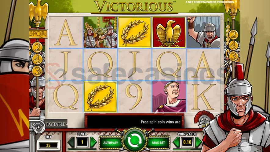 Είναι ένα από τα αρκετά slots με θέμα την ένδοξη Ρωμαϊκή Αυτοκρατορία. Φέρνει εικόνες και ήχους από τον πολύ δυνατό στρατό της εποχής, όπως και άλλα γνωστά έθιμα. To φόντο του είναι λαμπερό και περιέχει παρελαύνοντες Ρωμαίους στρατιώτες. Στις άκρες του ταμπλό θα δείτε κρανιοφόρους στρατιώτες. Κρατούν ένα κοντάρι με έναν χρυσό αετό επάνω και το νούμερο 243. Αυτό αντιπροσωπεύει τους πιθανούς συνδυασμούς του παιχνιδιού. Το soundtrack του Victorious είναι τα τύμπανα μίας στρατιωτικής μπάντας και ο μεταλλικός ήχος από ένα κρουόμενο γκογνκ. Τα οποία σε βάζουν για τα καλά στο κλίμα της εποχής.