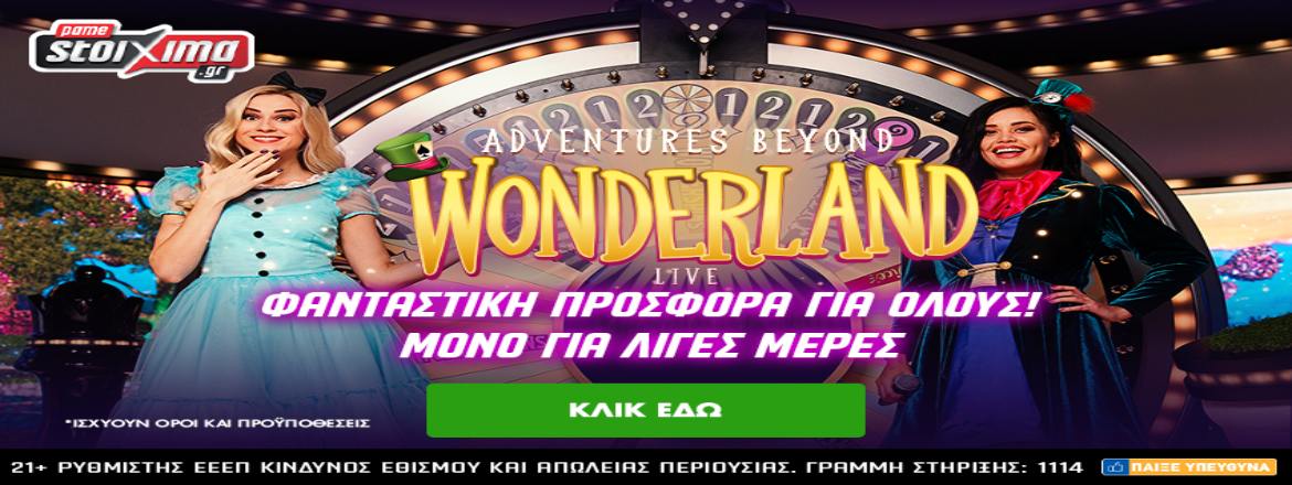 Νέα έκπληξη* από το Pamestoixima.gr Live Casino! Από σήμερα (07/10) και μέχρι την Κυριακή (10/07), διασκεδάζεις στο Adventures Beyond Wonderland της Playtech και έχεις την ευκαιρία να κάνεις τα κέρδη σου ακόμα περισσότερα με την ΜΟΝΑΔΙΚΗ ΠΡΟΣΦΟΡΑ* που σου έχει ετοιμάσει το Pamestoixima.gr. Αυτό που έχετε να κάνετε, είναι να διασκεδάσετε με το Adventures Beyond Wonderland και η παικτικότητά σας θα ανταμειφθεί με μοναδικό τρόπο, σε ένα παιχνίδι – έκπληξη.