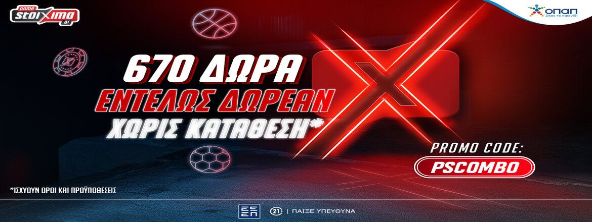Απλά χρησιμοποιείς το promo code (κωδικό) PSCOMBO στο απαραίτητο πεδίο και τα 670 έπαθλα* γίνονται δικά σου εντελώς δωρεάν, για να διασκεδάσεις με επιλογές σε όλες τις αθλητικές διοργανώσεις του κόσμου, αλλά και με αγαπημένα παιχνίδια και τραπέζια στο live casino.