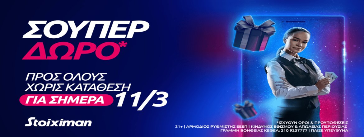 Η εβδομάδα ολοκληρώνεται με ιδανικό τρόπο στη Stoiximan. Ειδικότερα όλη την Παρασκευή (11/03) είναι διαθέσιμο για όλα τα μέλη της ένα σούπερ δώρο* το οποίο δεν απαιτεί καμία κατάθεση!