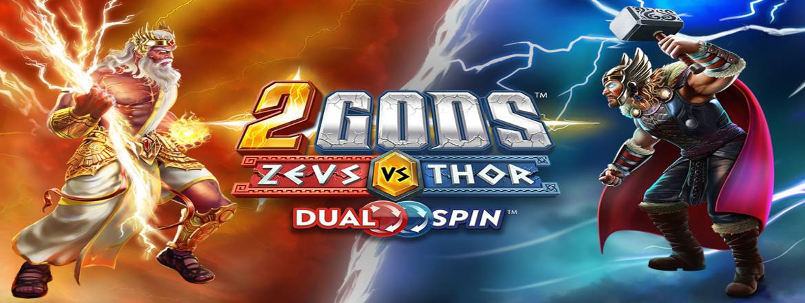 Στο 2 Gods Zeus vs Thor, στη μία πλευρά του… ρινγκ βρίσκεται ο Δίας, πατέρας των Θεών και Θεός της Αστραπής στην ελληνική μυθολογία. Στον αντίποδα, ο Θορ που θεωρείται ο… ομόλογός του στην σκανδιναβική μυθολογία. Το παιχνίδι έχει διάταξη 5×3. Στο αριστερό, κόκκινο, μισό του φόντου, κυριαρχεί η φιγούρα του Δια και τα ελληνικά σύμβολα, ενώ στην αριστερή, μπλε, η αντίστοιχη του Θορ και ρουνικά σύμβολα. Πλοία, κράνη και μυθικά πλάσματα προσγειώνονται στους κυλίνδρους, αντιπροσωπεύοντας τους δύο Θεούς.