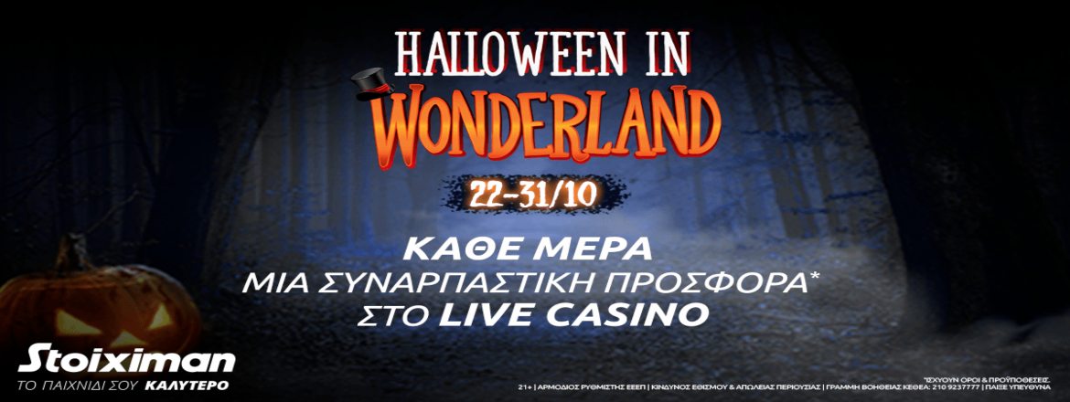 Halloween in Wonderland: Το διάσημο Adventures Beyond Wonderland Live γίνεται θεματικό γιορτάζοντας το Halloween με σούπερ προσφορά* στο Live Casino της Stoiximan, καθημερινά έως και τις 31/10, από τις 17:00 έως και τις 03:00!